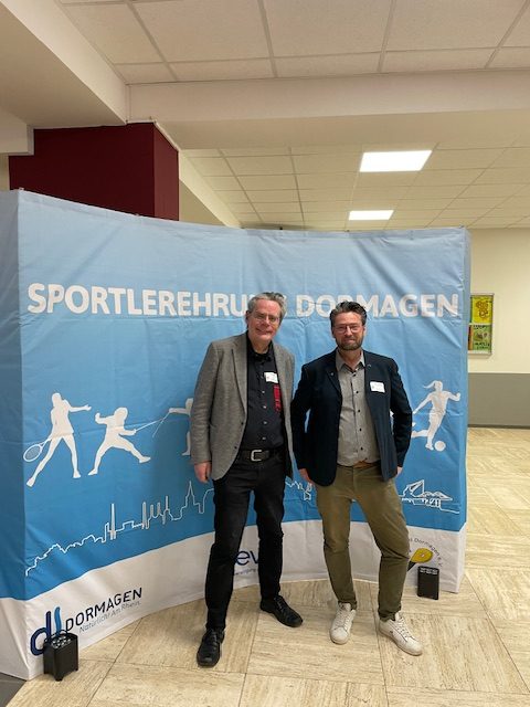 Am 18. März 2026 hat die Sportlerehrung Dormagen in der Aula des Bettina-von-Arnim-Gymnasums stattgfnden. Die Sportlerehrung ist gemeisam vom Sport-Verband Dormagen e. V., der Stadt Dormagen und der evd ausgerichtet worden. Moderiert wurde die Sportlerehrung vom Dormagener Bürgermeister Erik Lierenfeld. Unser Fraktionsvorsitznder Marcus Glöder war als Gast bei der Sportlerehrung. Hier ist ein Foto mit dem Ratsmitglied der Grünen, René Jungbluth. (Natürlich sind beide links. Nur auf dem Bild ist Marcus Glöder links und René Jungbluth rechts.)